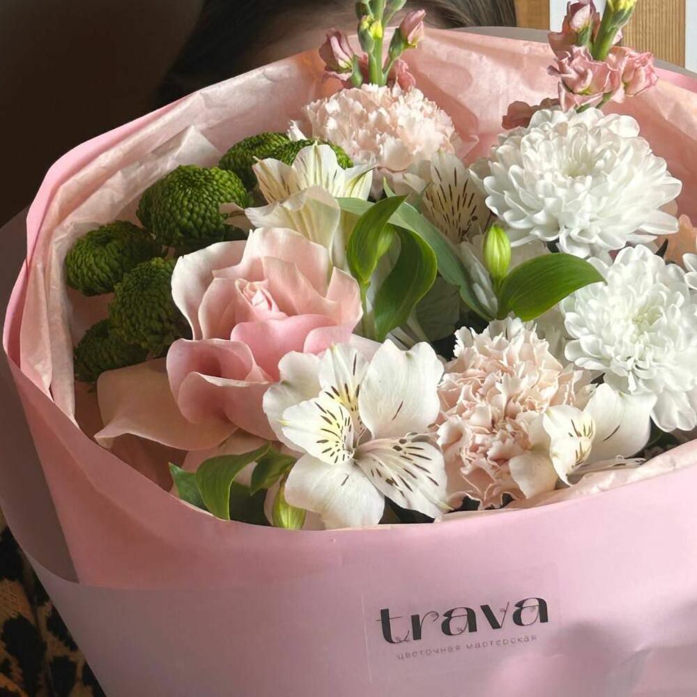 Нежный букет для мамы с хризантемой, розой, альстромерией и маттиолой