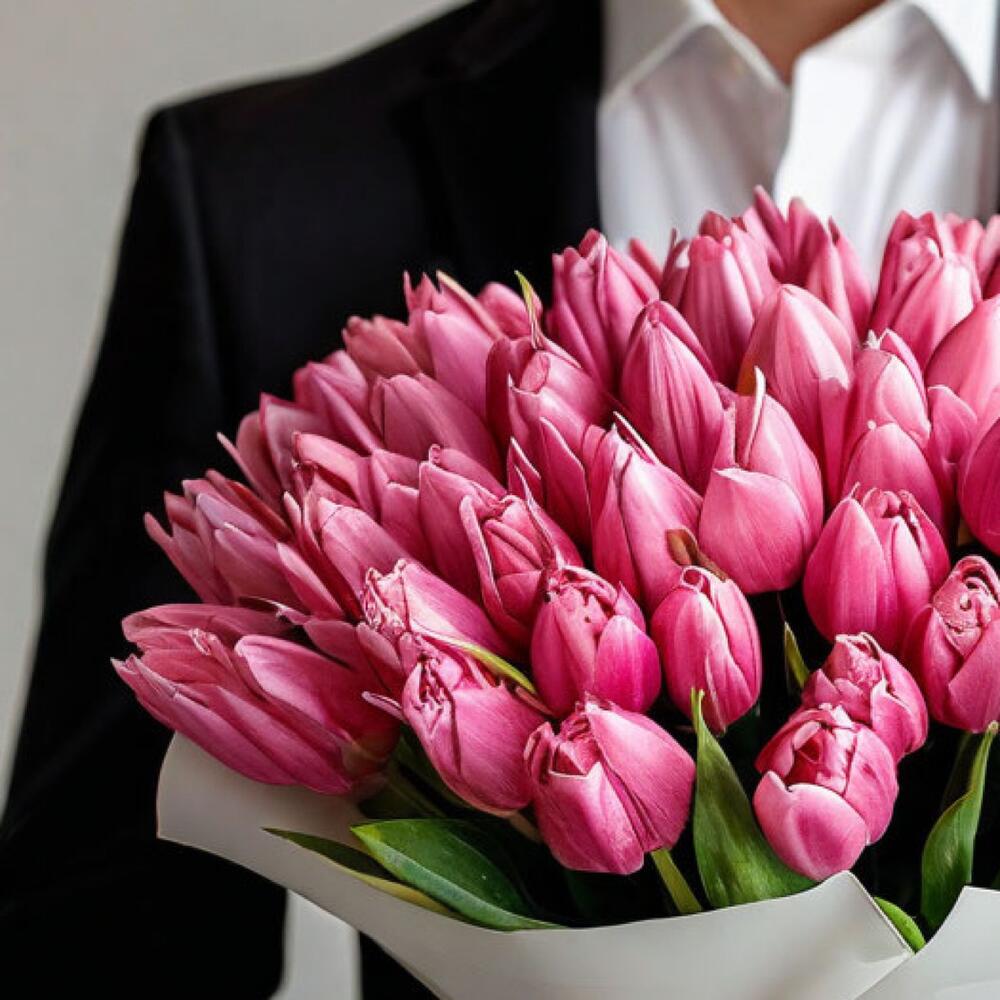 Элитные нежно-розовые тюльпаны в дизайнерской упаковке – весенняя радость в нежном обличии